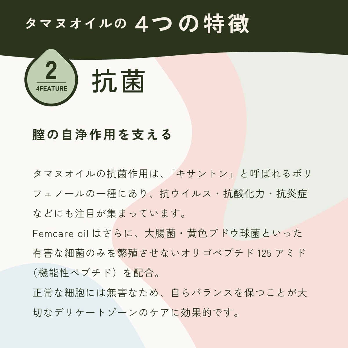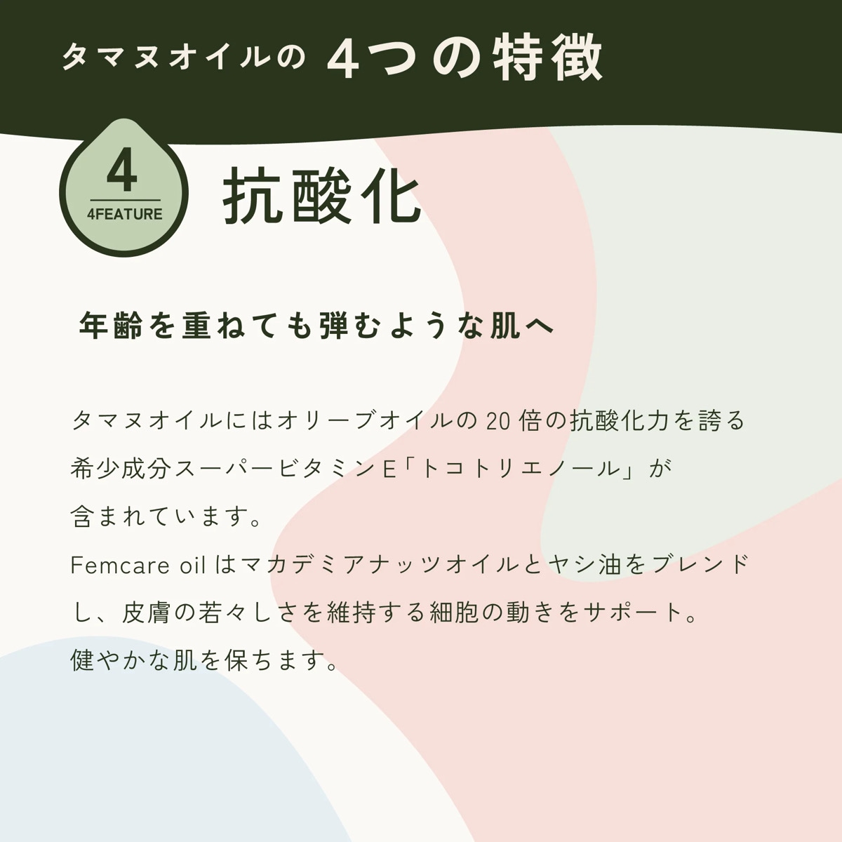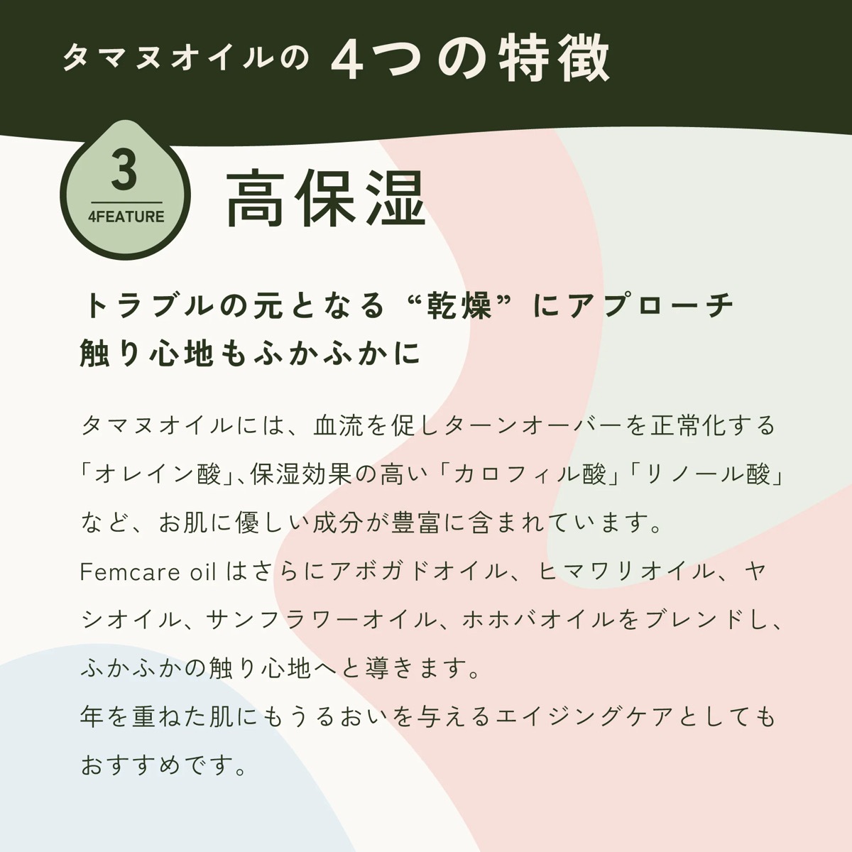 - ハワイの大自然で育ったタマヌオイルの恵みを贅沢に詰め込んだフェムケア専用オイルです。